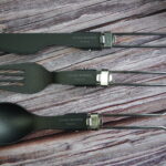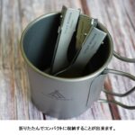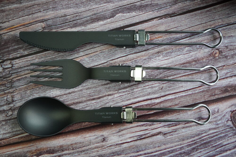 チタンのスプーン・フォーク・ナイフのセットです。ハンドルは折りたたみ式なのでコンパクトに収納可能。